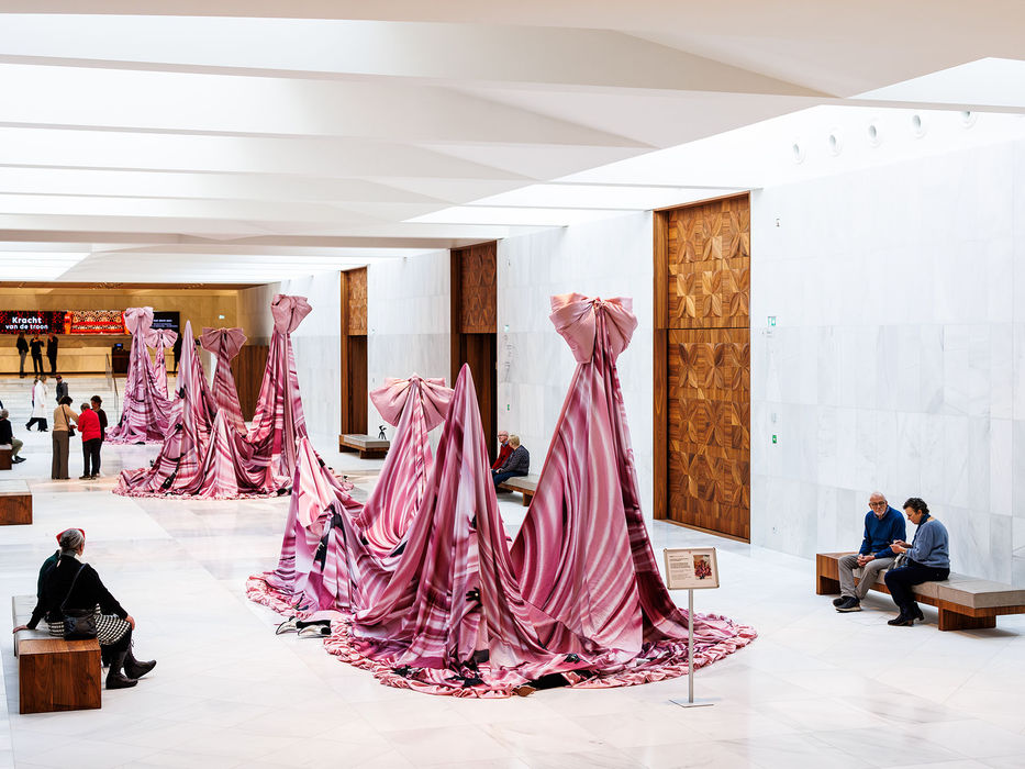 De grand foyer was omgetoverd tot een en al feestelijkheid, ook met een unieke installatie, ontworpen door MAISON the FAUX. De roze stof, de strikken en ruches: feest. Toch? De makers gaven niet te veel antwoorden, maar daagden de kijkers uit om zelf op zoek te gaan naar de betekenis. En is die er wel? Zijn er misschien meerdere, of is die voor iedereen ander?